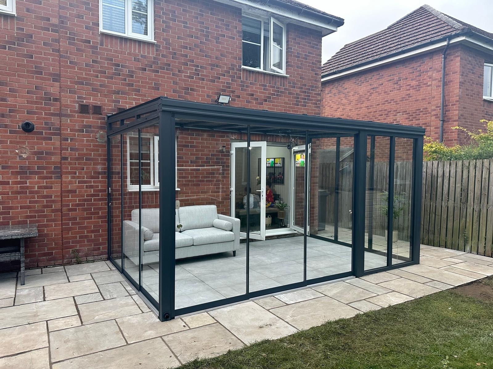 All of our glass rooms are constructed from aluminium and finished with toughened glass roof panels. The aluminium frame can be powder coated to any RAL colour, allowing you to match your home perfectly. For added comfort and atmosphere, we also offer shading solutions and optional heating and lighting, helping you create a modern, ambient space you can use throughout the year.